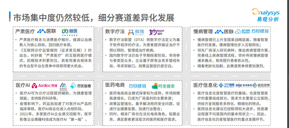 整體來看,市場集中度仍較低,行業(yè)呈多元化發(fā)展態(tài)勢,除醫(yī)藥電商外,慢病管理、醫(yī)療AI、數(shù)字療法、醫(yī)療信息化賽道均受關(guān)注程度較高。特別是自去年10月份《互聯(lián)網(wǎng)診療監(jiān)管細則(征求意見稿)》出臺之后,“嚴肅醫(yī)療”這個相對于消費醫(yī)療的概念,被頻繁提起,給出了行業(yè)發(fā)展的鮮明指向性,讓“醫(yī)歸醫(yī),藥歸藥”。報告指出,前期技術(shù)積累到位、具備完善合規(guī)體系的專業(yè)型平臺在競爭中將獲得更大機會。