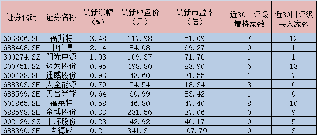 進一步梳理發(fā)現(xiàn),在30只個股中,賽伍技術、大金重工、中信博、金博股份、通威股份、帝科股份、航天機電、大全能源、隆基股份等9只個股最新收盤價較機構給予的最高目標價,仍有60%以上的上升空間。