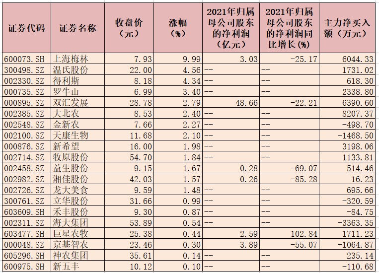 與此同時(shí),市場主力資金也積極布局豬肉概念股。4月11日,有17只個(gè)股獲得主力資金凈買入,合計(jì)買入額3.60億元,其中,大北農(nóng)、雙匯發(fā)展、上海梅林等3只個(gè)股主力資金凈買入額居前,分別為8207.37萬元、6390.60萬元、6044.33萬元,新希望、羅牛山、正邦科技、溫氏股份、巨星農(nóng)牧、牧原股份等6只個(gè)股主力資金凈買入額也均超1000萬元,上述9只個(gè)股合計(jì)吸金3.29億元。