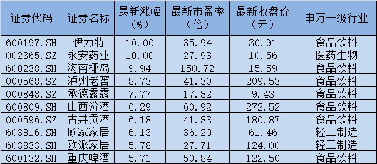 具體來看,伊力特、永安藥業(yè)等2只個股收獲漲停。海南椰島、瀘州老窖、承德露露、山西汾酒、古井貢酒、顧家家居等6只個股漲逾6%。