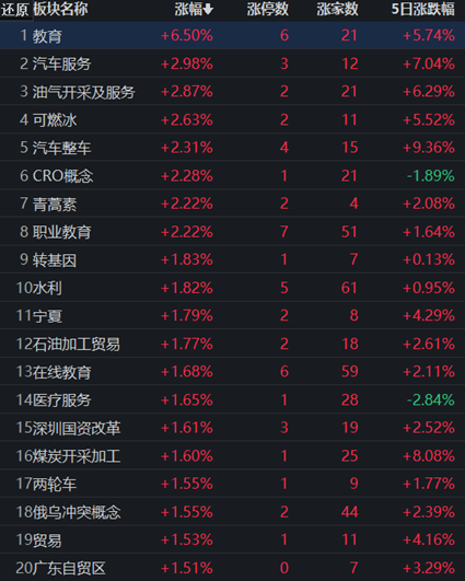 從同花順指數(shù)看,教育板塊指數(shù)漲幅居前,收報3609.06點,漲幅達6.50%。
