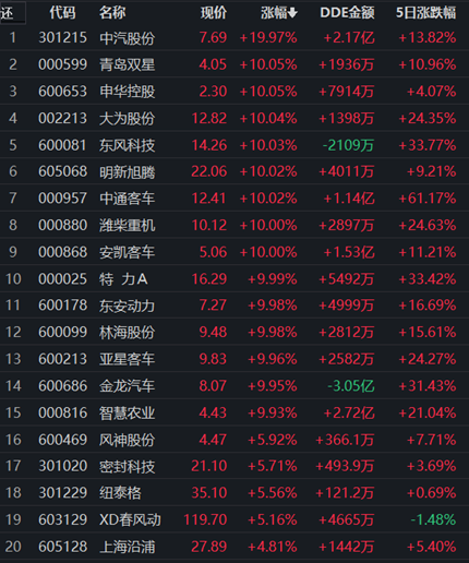 不僅是中通客車,整個汽車板塊表現(xiàn)突出,尾盤再度拉升,汽車整車板塊尾盤再度拉升,除中通客車11連板外,亞星客車直線封板,安凱客車、金龍汽車回封漲停,漲停股合計達15只。