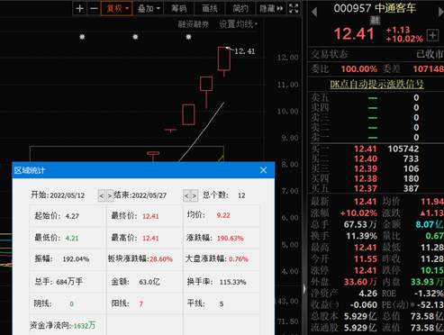 5月27日,中通客車?yán)^續(xù)強勢上漲,開盤12分鐘封住漲停,截至收盤,封板買一單達105742手。該股自5月12日以來連續(xù)12日上漲,累計上漲190.63%,最近11個交易日連續(xù)拉漲停板。