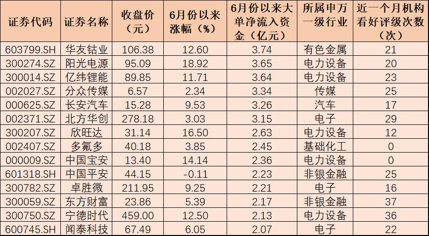 表:6月份以來獲得大單凈流入資金超2億元個股一覽