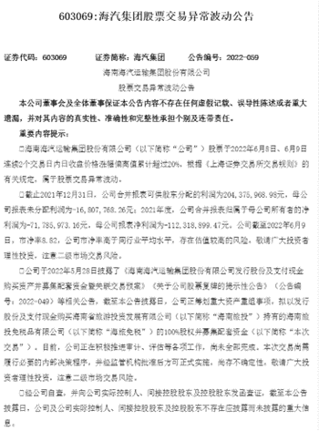 公告還顯示,公司于2022年5月28日披露了《海南海汽運(yùn)輸集團(tuán)股份有限公司發(fā)行股份及支付現(xiàn)金購買資產(chǎn)并募集配套資金暨關(guān)聯(lián)交易預(yù)案》《關(guān)于公司股票復(fù)牌的提示性公告》(公告編號:2022-049)等相關(guān)公告,截至本公告披露日,公司正籌劃重大資產(chǎn)重組事項,擬以發(fā)行股份及支付現(xiàn)金購買海南省旅游投資發(fā)展有限公司(以下簡稱“海南旅投”)持有的海南旅投免稅品有限公司(以下簡稱“海旅免稅”)的100%股權(quán)并募集配套資金(以下簡稱“本次交易”)。目前,公司正在積極推進(jìn)審計、評估等各項工作,尚未全部完成。本次交易尚需履行必要的內(nèi)部決策程序,并經(jīng)監(jiān)管機(jī)構(gòu)批準(zhǔn)后方可正式實(shí)施,尚存不確定性。敬請廣大投資者理性投資,注意二級市場交易風(fēng)險。