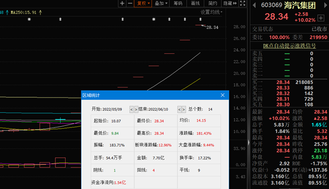 6月10日,海汽集團(tuán)繼續(xù)漲停,這是該股實(shí)現(xiàn)14連陽走勢,且最近9個交易日均實(shí)現(xiàn)一字漲停板,14日累計漲幅達(dá)181.43%。截至今日收盤,海汽集團(tuán)報28.34元,成交額達(dá)1.65億元,換手率1.84%,買一封單達(dá)218085手。