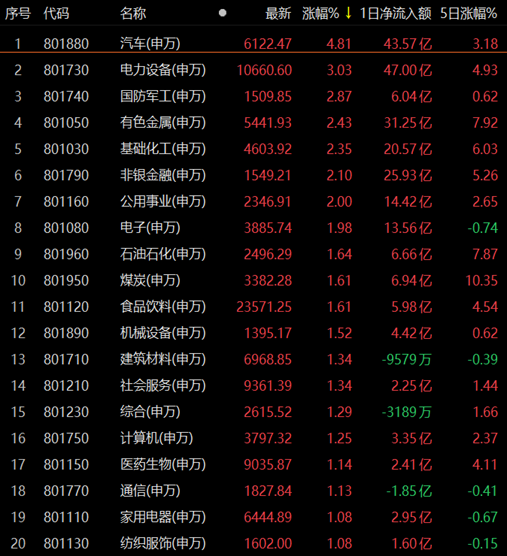 從申萬一級行業(yè)看,汽車行業(yè)漲幅居前,收報6122.47點(diǎn),漲幅達(dá)4.81%。