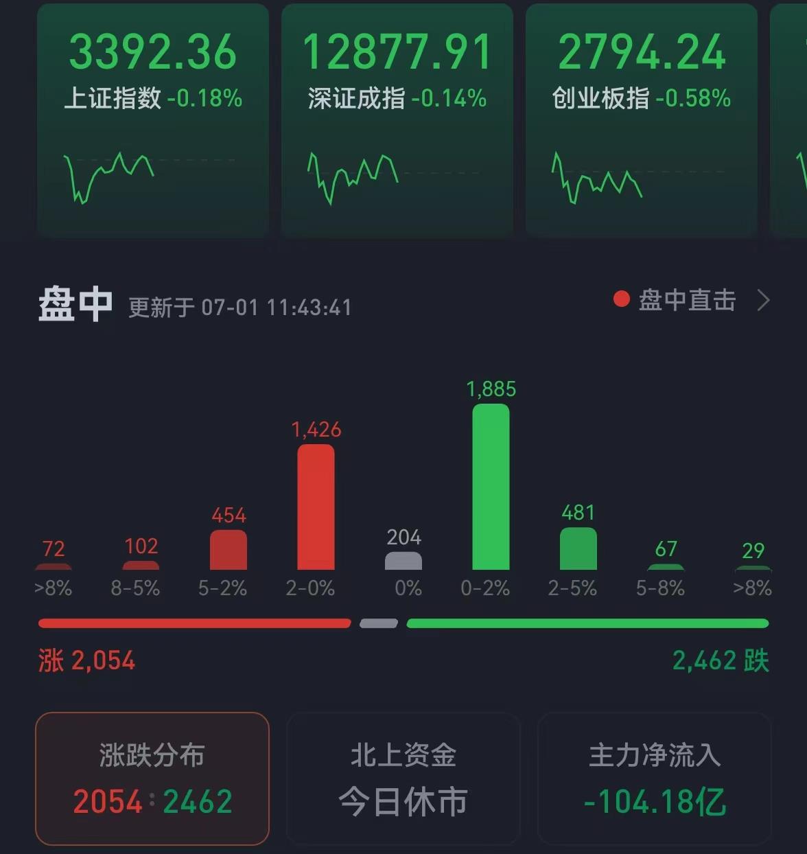 周五(7月1日),三大股指震蕩回落。截至上午收盤(pán),上證指數(shù)跌0.18%,報(bào)3392.36點(diǎn),失守3400點(diǎn)整數(shù)關(guān)口;深證成指和創(chuàng)業(yè)板指跌幅分別為0.14%和0.58%;滬深兩市合計(jì)成交額6701.8億元;總體來(lái)看,兩市個(gè)股漲少跌多。