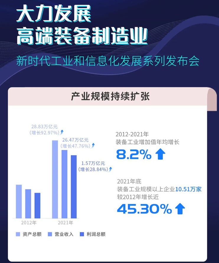 十年來(lái),我國(guó)裝備工業(yè)產(chǎn)業(yè)規(guī)模持續(xù)擴(kuò)張,產(chǎn)業(yè)結(jié)構(gòu)持續(xù)優(yōu)化。數(shù)據(jù)顯示,2012年—2021年,裝備工業(yè)增加值年均增長(zhǎng)8.2%,始終保持中高速,至2021年底,裝備工業(yè)規(guī)模以上企業(yè)達(dá)10.51萬(wàn)家,比2012年增長(zhǎng)近45.30%;資產(chǎn)總額、營(yíng)業(yè)收入、利潤(rùn)總額分別達(dá)到28.83萬(wàn)億元、26.47萬(wàn)億元和1.57萬(wàn)億元,比2012年分別增長(zhǎng)92.97%、47.76%、28.84%。