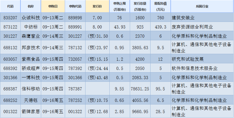 新股方面,根據(jù)發(fā)行安排,A股市場(chǎng)本周(9月13日-9月16日)將有10只新股申購。