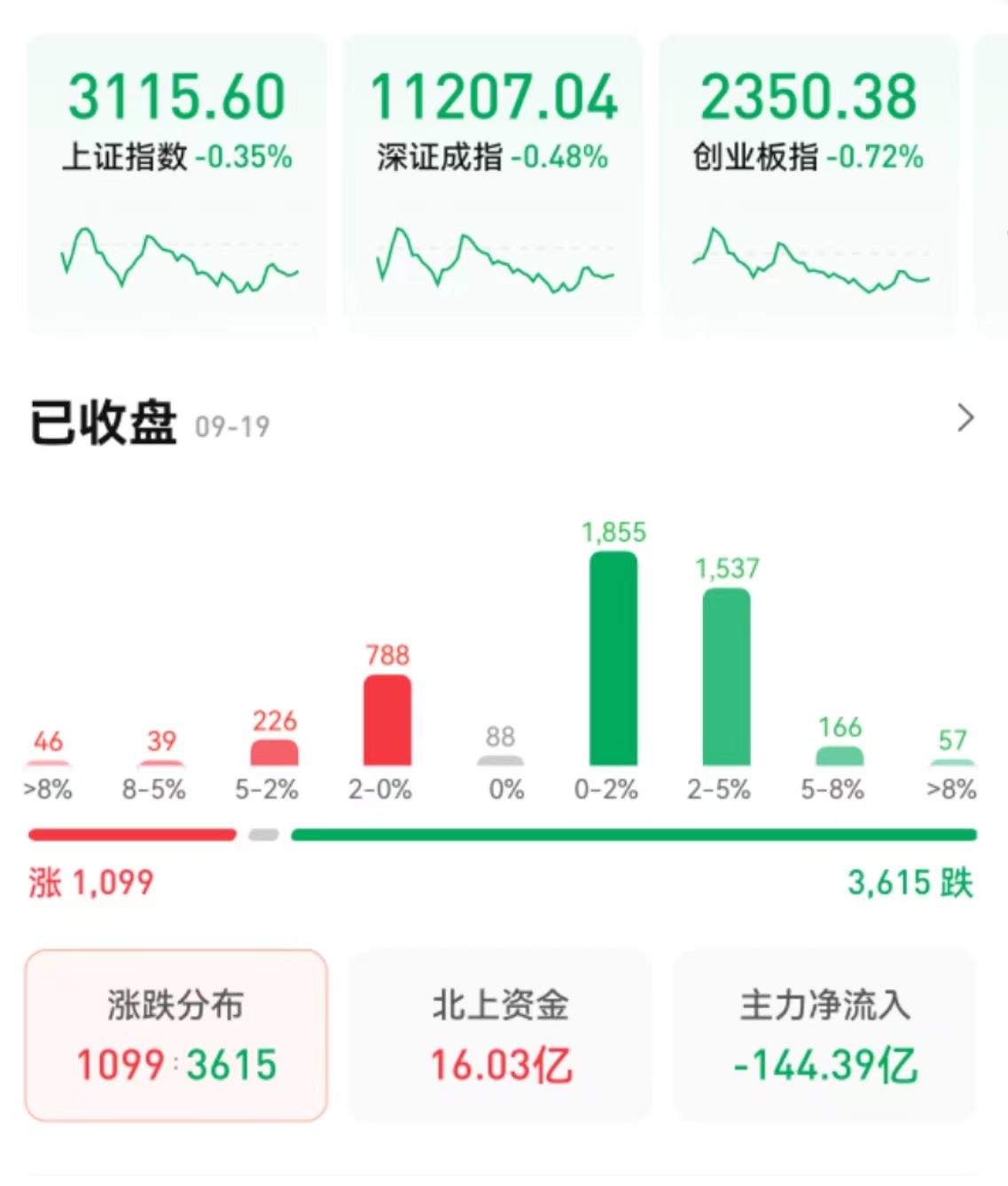 9月19日,A股三大指數(shù)震蕩回落,集體收跌。截至收盤,上證指數(shù)跌0.35%報3115.6點,深證成指跌0.48%報11207.04點,創(chuàng)業(yè)板指跌0.72%報2350.38點,走出了日線五連陰的態(tài)勢。兩市合計成交6653億元,成交額創(chuàng)年內新低??傮w來看,A股個股跌多漲少,上漲個股為1099只,下跌個股3615只。