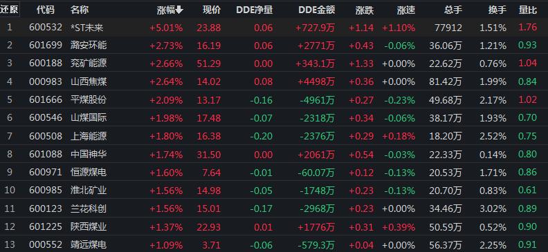9月19日,煤炭行業(yè)漲幅居首達1.11%.其中,*ST未來漲停。