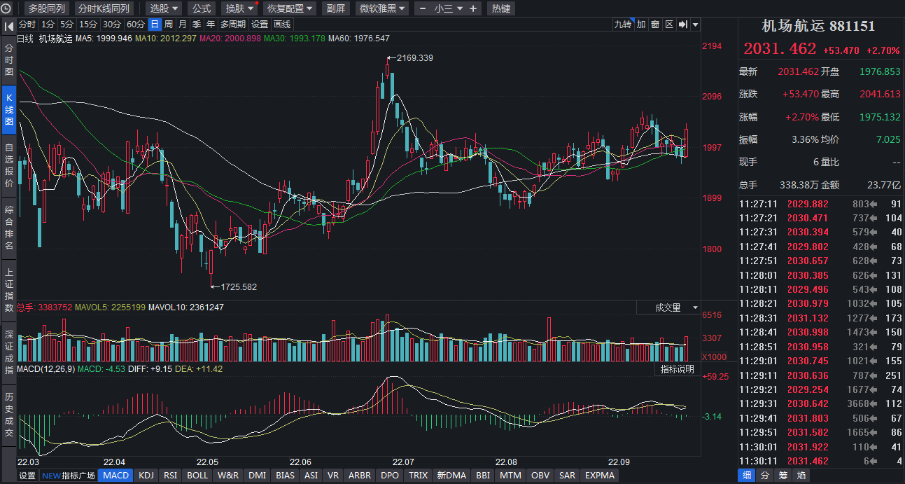 受國際油價下跌及即將到來的十一國慶出行需求提升的影響,9月26日,A股同花順機場航運行業(yè)板塊表現(xiàn)突出,截至11:30,機場航運板塊指數(shù)漲2.7%,位居同花順行業(yè)漲幅榜前列,大幅跑贏上證指數(shù)(跌幅0.08%)。板塊內(nèi)共13只個股,其中11只個股實現(xiàn)上漲,春秋航空漲超5%,達到5.89%。
