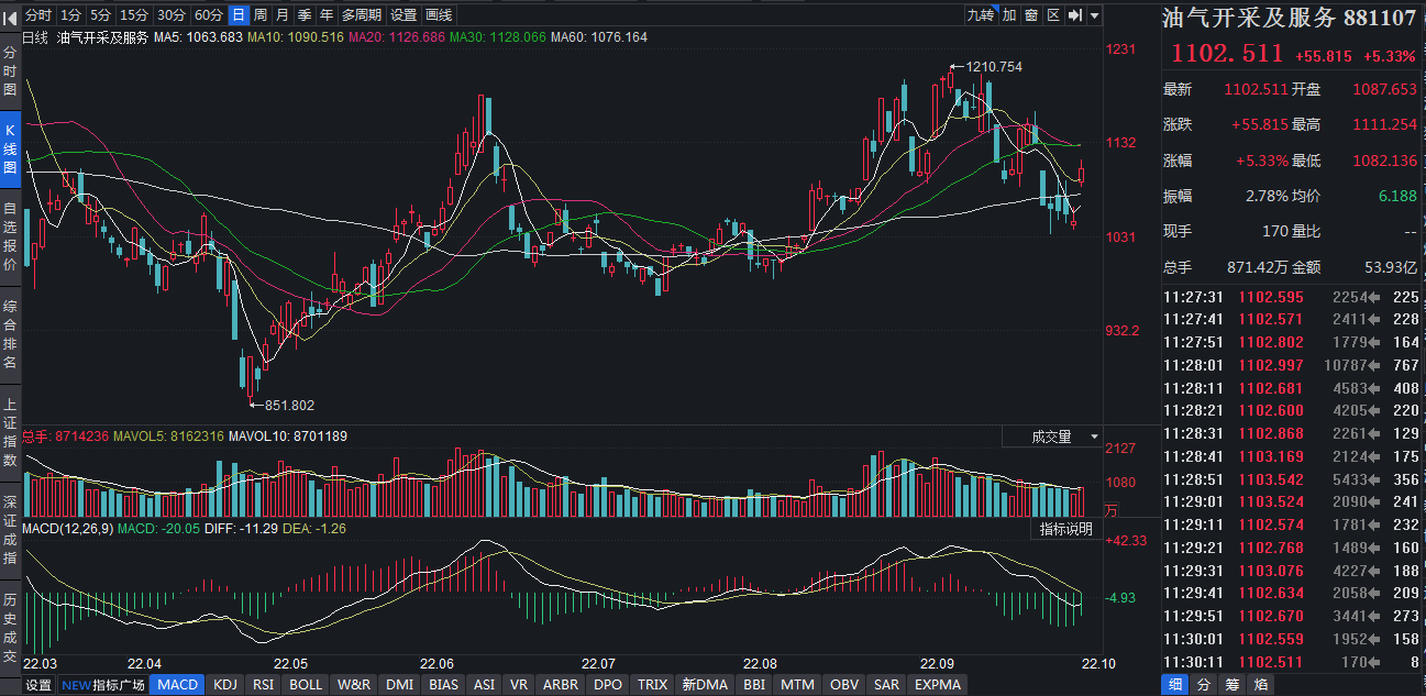 受?chē)?guó)際油價(jià)顯著反彈等因素的影響,10月10日,A股同花順油氣開(kāi)采及服務(wù)板塊表現(xiàn)強(qiáng)勢(shì),截至11:30,油氣開(kāi)采及服務(wù)板塊指數(shù)漲5.33%,位居同花順行業(yè)漲幅榜前列,大幅跑贏上證指數(shù)(跌幅0.39%)。板塊內(nèi)21只個(gè)股全部實(shí)現(xiàn)上漲,其中,貝肯能源漲停。