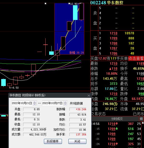 10月27日,熱門(mén)股華東數(shù)控漲停,截至收盤(pán),報(bào)12.10元,連續(xù)5個(gè)交易日實(shí)現(xiàn)上漲,累計(jì)漲幅達(dá)39.24%,月內(nèi)累計(jì)漲幅達(dá)71.88%。