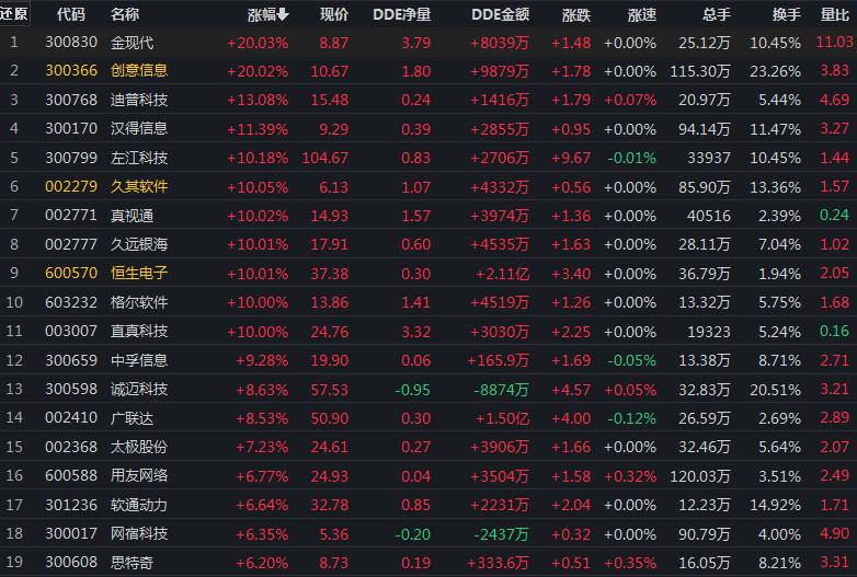 10月27日,計(jì)算機(jī)行業(yè)漲幅居首,達(dá)1.95%。其中,金現(xiàn)代、創(chuàng)意信息、久其軟件、真視通、久遠(yuǎn)銀海、恒生電子、格爾軟件、直真科技、ST泛微等9只概念股集體漲停。