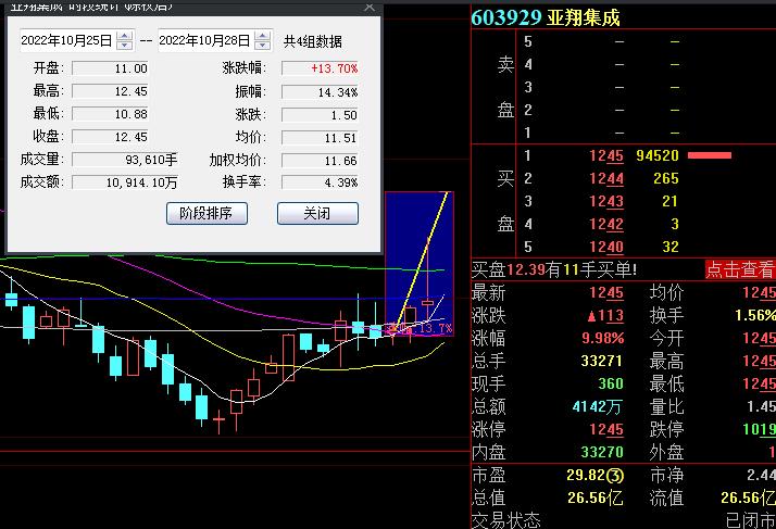 10月28日,熱門股亞翔集成漲停,截至收盤,報(bào)12.45元,連續(xù)4個(gè)交易日實(shí)現(xiàn)上漲,累計(jì)漲幅達(dá)13.7%。