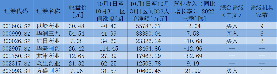 表:10月1日至10月31日,獲大單資金凈流入額超1億元的中藥板塊個股一覽