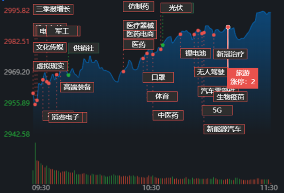 11月2日早盤,A股市場(chǎng)三大指數(shù)低開后震蕩走高,創(chuàng)業(yè)板指漲幅最大。截至上午11:30,上證指數(shù)漲0.88%,報(bào)2995.26點(diǎn);深證成指和創(chuàng)業(yè)板指漲幅分別為1.10%和1.41%;滬深兩市合計(jì)成交額6077.9億元,較前一交易日增長(zhǎng)2.86%??傮w來看,A股市場(chǎng)個(gè)股漲多跌少,有73只個(gè)股漲停,跌停個(gè)股1只。