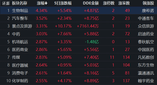 同花順行業(yè)方面,截至11月2日11:30,76類行業(yè)中74類上漲,占比97.37%,其中,生物制品漲幅居首,達(dá)4.34%,此外,汽車整車、景點(diǎn)及旅游、中藥等行業(yè)漲幅均超3%。下跌的行業(yè)中,銀行居首,跌幅達(dá)0.82%。
