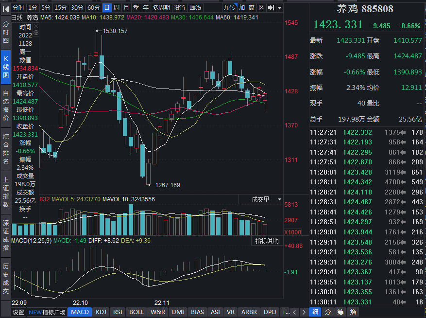 在雞苗及肉雞價(jià)格持續(xù)高位帶動下,同花順養(yǎng)雞概念板塊本月表現(xiàn)十分突出。同花順數(shù)據(jù)顯示,11月1日至11月25日,養(yǎng)雞板塊指數(shù)期間累計(jì)上漲9.83%,跑贏上證指數(shù)(期間累計(jì)漲幅7.2%)。板塊內(nèi)21只個(gè)股中共有19只實(shí)現(xiàn)上漲,占比超九成。個(gè)股方面,包括益生股份、禾豐股份、曉鳴股份、民和股份、圣農(nóng)發(fā)展等在內(nèi)的8只個(gè)股期間累計(jì)漲幅均超10%。
