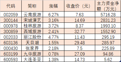 表:12月6日受到主力資金追捧的景點及旅游概念股