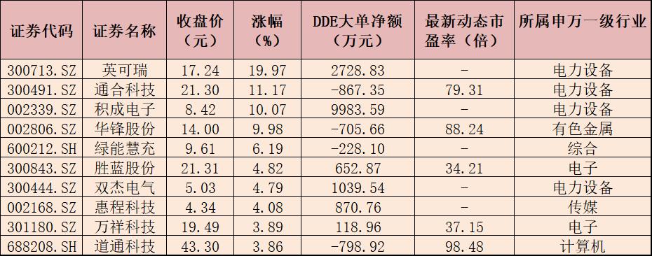 表:2月6日高壓快充板塊內(nèi)漲幅居前十的個(gè)股一覽
