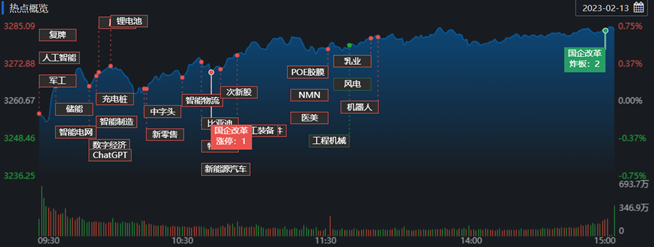 2月13日,滬深兩市三大指數(shù)表現(xiàn)相對強勢,各指數(shù)均在全天最高點附近報收,滬指再次逼近3300點整數(shù)關口。截至收盤,上證指數(shù)漲0.72%報3284.16點;深證成指漲1.14%報12113.61點,創(chuàng)業(yè)板指漲1.10%報2573.18點,A股合計成交額9789.48億元,較前一交易日增長9.66%,北向資金凈買入6.92億元。總體上看,個股漲多跌少,有3509只上漲,1346只下跌。