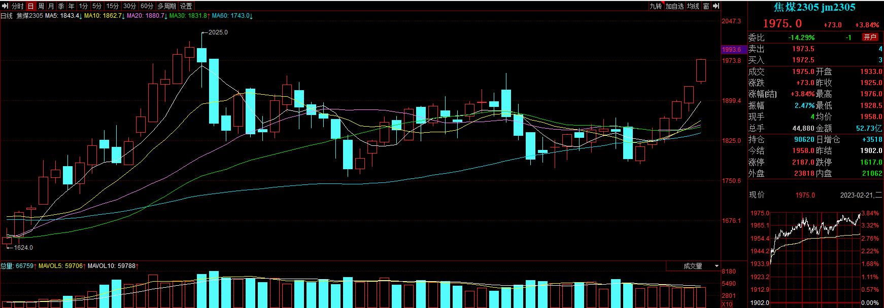 2月21日,煤炭期貨主力合約表現(xiàn)搶眼,“雙焦”期貨主力合約實現(xiàn)六連陽。具體來看,今日焦煤期貨主力合約連續(xù)第6個交易日上漲,該主力合約盤中最高上探至1976元/噸,截至收盤,漲幅達3.84%,報收1975元/噸。同時,焦炭期貨主力合約也持續(xù)活躍,2月21日該主力合約漲2.21%,日線實現(xiàn)六連陽,報收2895元/噸。