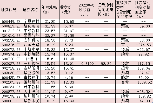 表2:年內(nèi)累計(jì)漲幅超10%的建筑材料股
