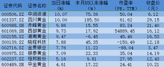 表:3月20日A股貴金屬板塊漲幅前十位個股一覽: