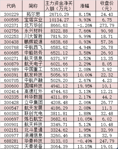 表:3月21日受到3000萬元以上主力資金追捧的軍工概念股