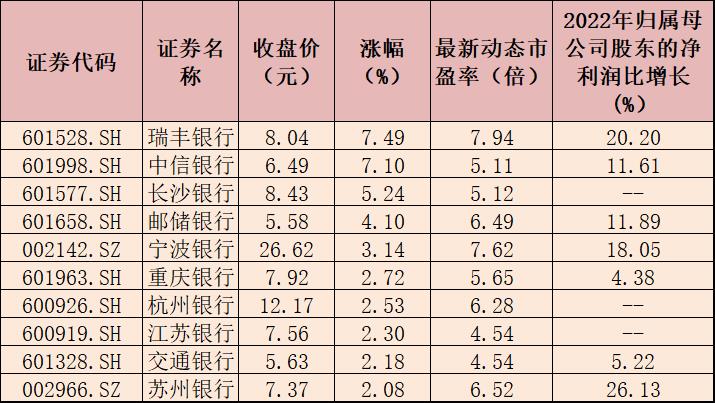 經(jīng)過(guò)連續(xù)2個(gè)交易日下跌后,4月25日,銀行板塊止跌轉(zhuǎn)漲,同花順數(shù)據(jù)顯示,截至收盤(pán),銀行板塊漲1.82%,位列同花順板塊漲幅榜第二,板塊內(nèi)42只個(gè)股全部上漲,其中,瑞豐銀行、中信銀行、長(zhǎng)沙銀行漲幅居前三,分別上漲7.49%、7.10%、5.24%。