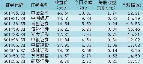 5月9日,證券板塊走勢強勁,指數(shù)盤中最高漲幅達4.98%,中金公司、中國銀河、首創(chuàng)證券、信達證券、光大證券、中銀證券等券商股盤中也一度漲停。截至收盤,A股三大指數(shù)沖高回落,全線下跌,證券板塊仍逆勢上漲1.39%,41只個股實現(xiàn)上漲,其中,中金公司延續(xù)漲停,中國銀河、首創(chuàng)證券、信達證券等券商股漲幅均超5%。