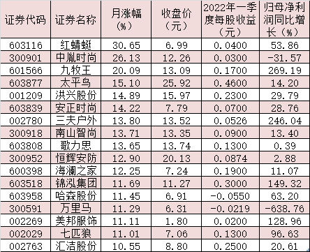 5月份以來(lái),截至5月15日,紡織服裝板塊集體崛起,其整體漲4.56%,跑贏上證指數(shù)(月內(nèi)累計(jì)跌0.38%)。其中,17只個(gè)股月內(nèi)累計(jì)漲幅超10%,紅蜻蜓、中胤時(shí)尚、九牧王等3只個(gè)股期間累計(jì)漲幅居前,均超20%。