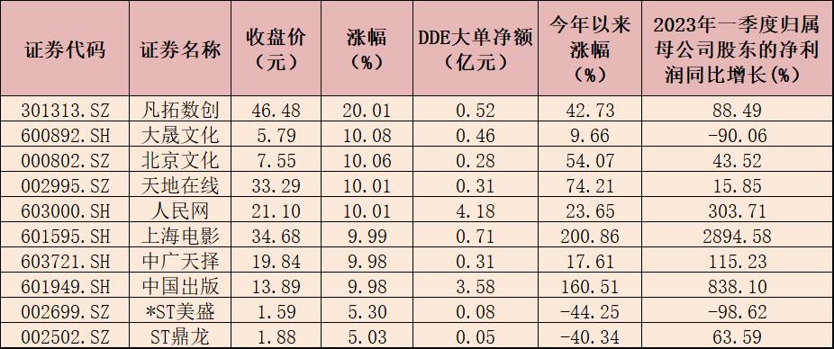 6月5日,傳媒板塊走強(qiáng),截至收盤,傳媒板塊漲3.43%,位列同花順板塊漲幅榜第三,其中,包括凡拓數(shù)創(chuàng)、大晟文化、北京文化、天地在線、人民網(wǎng)等在內(nèi)10只概念股集體漲停。