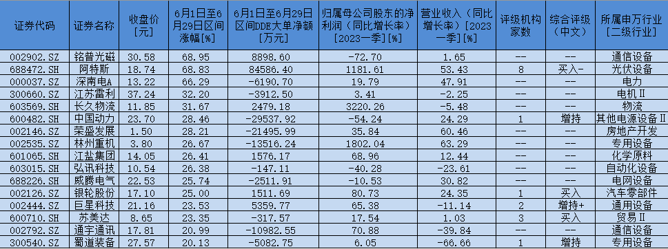 表:6月1日至6月29日,同花順儲能概念板塊期間累計上漲超20%個股一覽