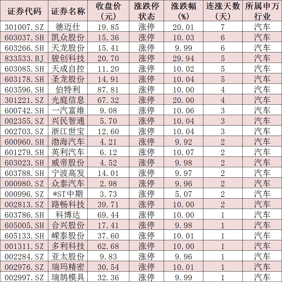 具體來看,今日,汽車產(chǎn)業(yè)鏈徹底爆發(fā),掀起了罕見的漲停潮,其中,胎壓監(jiān)測板塊領(lǐng)漲,路暢科技等5只個股漲停;新能源汽車概念股持續(xù)強勢,包括德邁仕、英利汽車等多只概念股漲停;無人駕駛板塊持續(xù)走強,得潤電子等16只概念股漲停;汽車零部件股集體走強,圣龍股份等23只個股漲停;創(chuàng)新藥概念股午后異動,海思科、通化金馬漲停;EDR概念、華為汽車、減速器、汽車芯片、車聯(lián)網(wǎng)、傳感器、英偉達概念、第三代半導(dǎo)體等板塊表現(xiàn)活躍。中船系板塊領(lǐng)跌,芬太尼、醫(yī)藥商業(yè)、毛發(fā)醫(yī)療、醫(yī)藥電商、房地產(chǎn)服務(wù)、電力、教育、銀行等板塊跌幅居前。