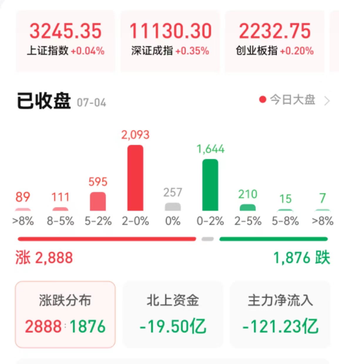周二(7月4日),A股三大股指震蕩上行,全線飄紅。截至收盤,上證指數(shù)微漲0.04%報3245.35點,深證成指漲0.35%報11130.3點,創(chuàng)業(yè)板指漲0.2%報2232.75點,兩市合計成交金額達9293億元,北向資金凈賣出19.5億元??傮w上看,兩市個股漲多跌少。其中,漲停個股達60只,跌停個股5只。
