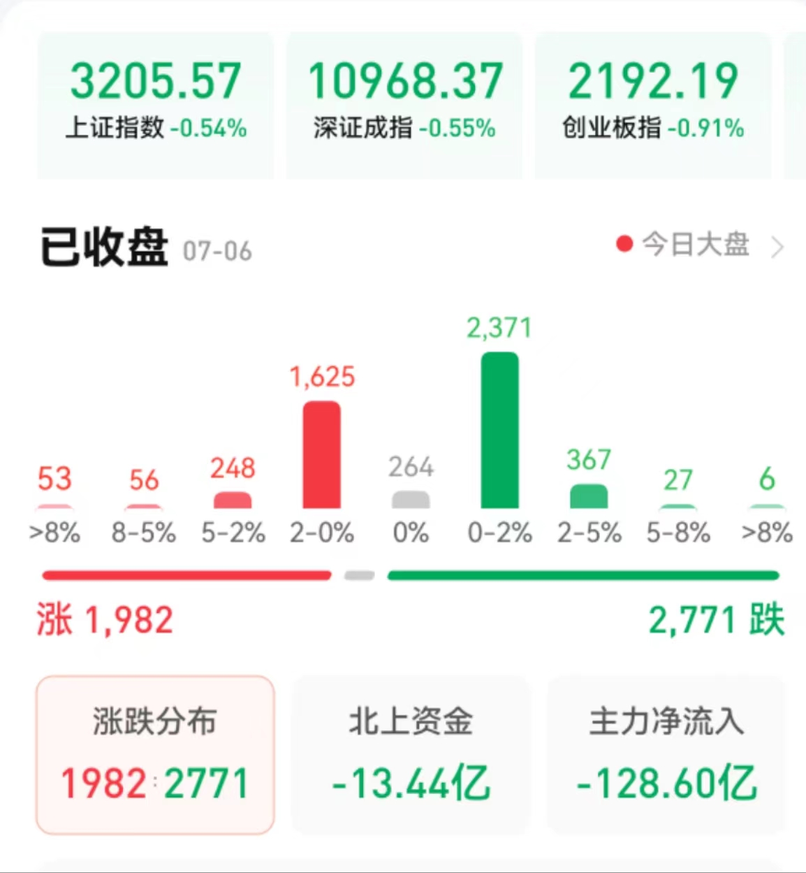 周四(7月6日),A股三大股指震蕩下行,略有回落。截至收盤,上證指數(shù)跌0.54%報(bào)3205.57點(diǎn),深證成指跌0.55%報(bào)10968.37點(diǎn),創(chuàng)業(yè)板指跌0.91%報(bào)2192.19點(diǎn),兩市合計(jì)成交金額達(dá)8198億元,北向資金凈賣出13.44億元??傮w上看,兩市個股跌多漲少。其中,漲停個股達(dá)38只,跌停個股6只。