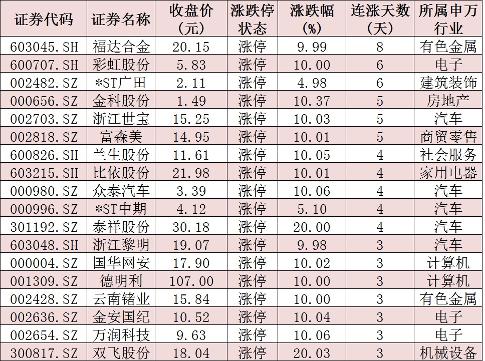 表:連續(xù)上漲3日且今日收盤漲停個股情況: