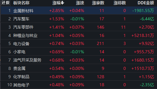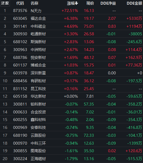 從早盤表現(xiàn)強(qiáng)勢的金屬新材料行業(yè)看,交易中的26只成份股中,有11只上漲,其中,有2只個(gè)股漲幅超5%。資金方面,有1981.55萬元大單資金凈流出該行業(yè)。