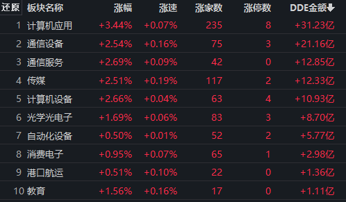 從早盤表現(xiàn)強(qiáng)勢的計算機(jī)應(yīng)用行業(yè)看,交易中的253只成分股中,有235只上漲,其中,有39只個股漲幅超5%。此外,與計算機(jī)應(yīng)用相關(guān)的互聯(lián)網(wǎng)概念板塊如數(shù)據(jù)安全、數(shù)據(jù)確權(quán)、華為鯤鵬等也表現(xiàn)活躍,漲幅均超4%。資金方面,有31.23億元大單資金凈流入該行業(yè),居第1位。