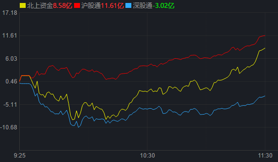 從資金面來看,7月14日上午,北上資金凈買入金額達(dá)8.58億元,其中,滬股通凈買入11.61億元,深股通凈賣出3.02億元。