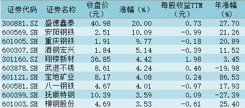 表:今日鋼鐵板塊漲幅前十個股一覽