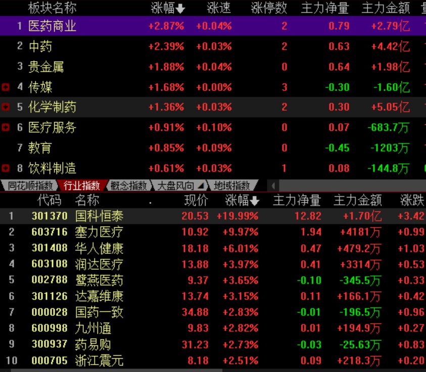 具體看,截至8月8日上午收盤,醫(yī)藥商業(yè)板塊表現(xiàn)出色,漲幅達(dá)2.87%。其中,國(guó)科恒泰和塞力醫(yī)療強(qiáng)勢(shì)漲停。
