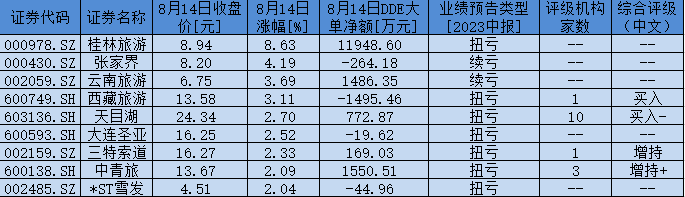表:8月14日,景點及旅游板塊漲幅超2%個股一覽