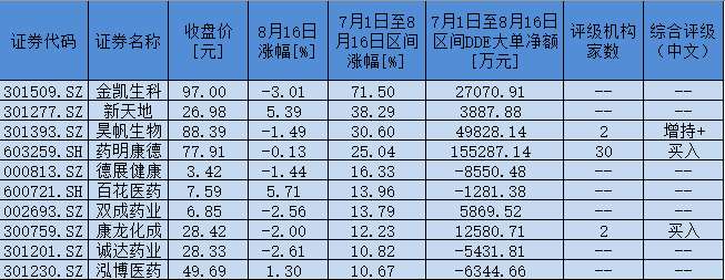近期,同花順CRO(委托研究機構(gòu))概念板塊結(jié)束了連續(xù)數(shù)月的下跌行情,顯露企穩(wěn)反彈跡象。7月1日至8月16日期間累計漲幅4.24%。其中,包括金凱生科、新天地、昊帆生物、藥明康德、德展健康等在內(nèi)的10只個股漲幅均超10%。
