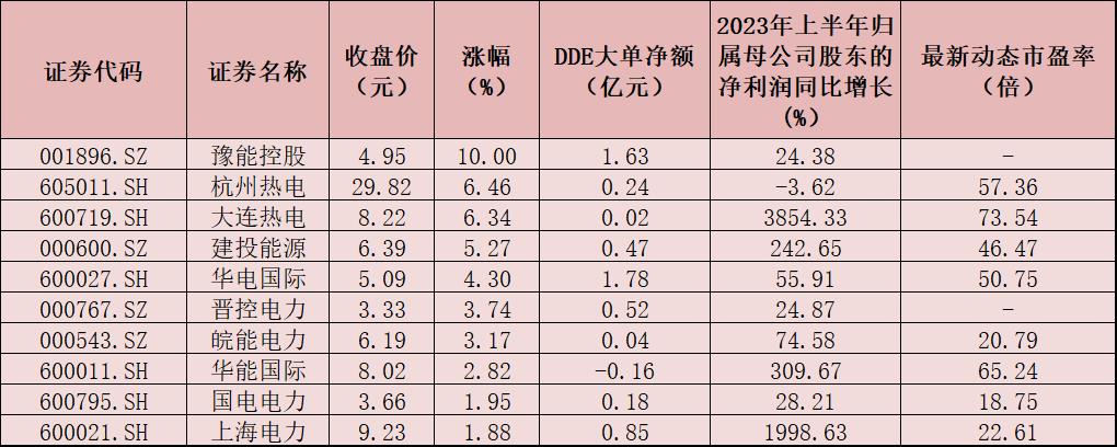 表:9月5日電力板塊內(nèi)漲幅居前十的個(gè)股一覽