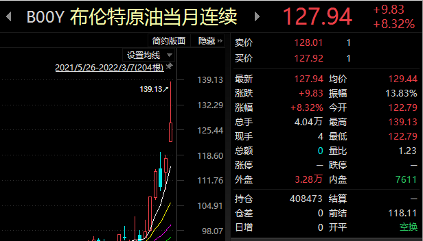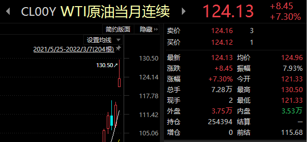 北京時(shí)間3月7日,美、布原油期貨再次迎來(lái)大漲。其中,布倫特原油一度漲逾10%,升至139.13美元/桶,而WTI原油期貨則突破130美元/桶。截至11點(diǎn)12分記者發(fā)稿,布倫特原油和WTI原油分別報(bào)128.77美元/桶、124.40美元/桶,今年以來(lái)累計(jì)漲幅均超65%。